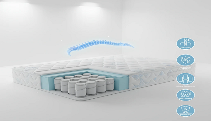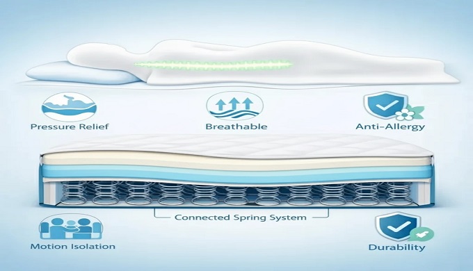 فناوری فنر متصل (مانند مانی): در تشکهای فنر متصل، فنرها به هم متصل هستند و مقداری سختی و واکنشپذیری دارند. این ساختار اطمینان میدهد که کل سطح تشک به طور یکنواخت وزن بدن را توزیع کند و به شکلدهی بدن کمک کند، به ویژه برای افرادی که نیاز به پشتیبانی محکمتری دارند.